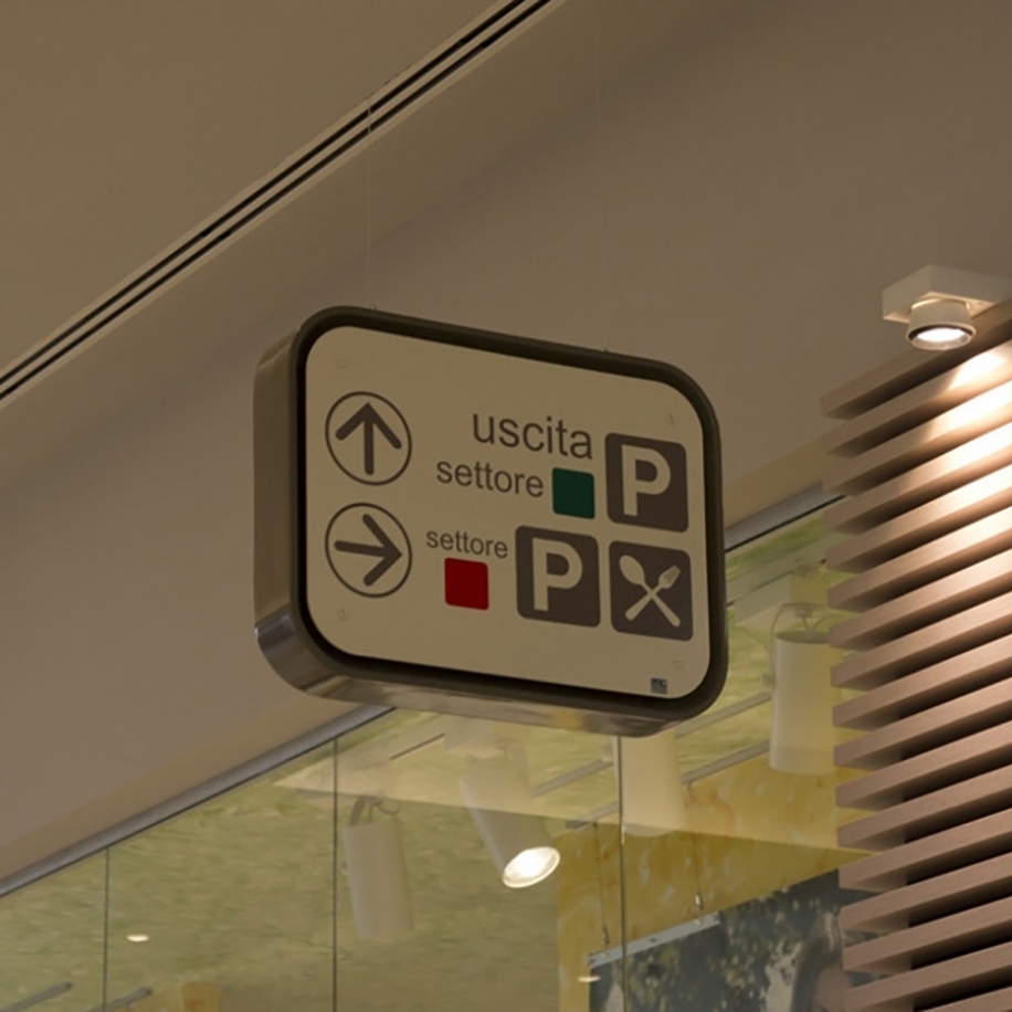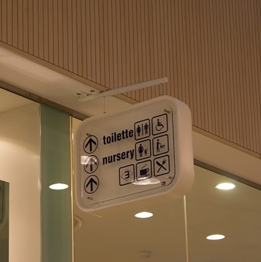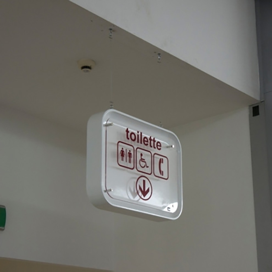 Διπλής όψης πινακίδα πληροφοριών επιτοίχια ή οροφής με κατασκευασμένη από fiberglass και πίνακα απόmethacrylate. Γραφικά σε συγκολλητικό φιλμ. Επιλογή για χρήση φωτισμού LED